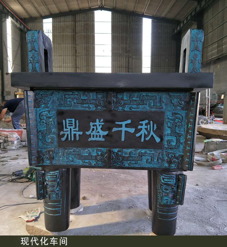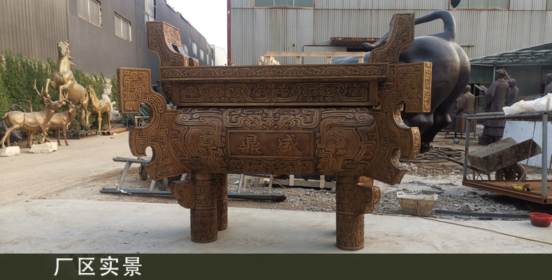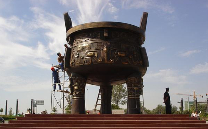 大型銅鼎雕塑是我國青銅文化時期的代表,鼎在古代被視為立國重器,是權力的象征。直到現在,人們仍然有一種鼎崇拜的意識,“鼎”字也被賦予“顯赫”、“ 尊貴”、“盛大”等引申意義,如:一言九鼎、大名鼎鼎、鼎盛時期、鼎力相助,等等。鼎又是旌功記績的禮器,周代的國君或王公大臣在重大慶典或接受賞賜時都要鑄鼎,以旌表功績,記載盛況。